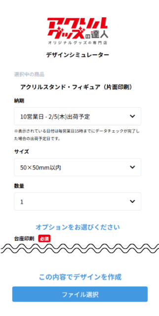 データを作ってからそのまま注文することもできるので、もし注文する場合の納期やサイズ、数量、オプションを選択していきます。