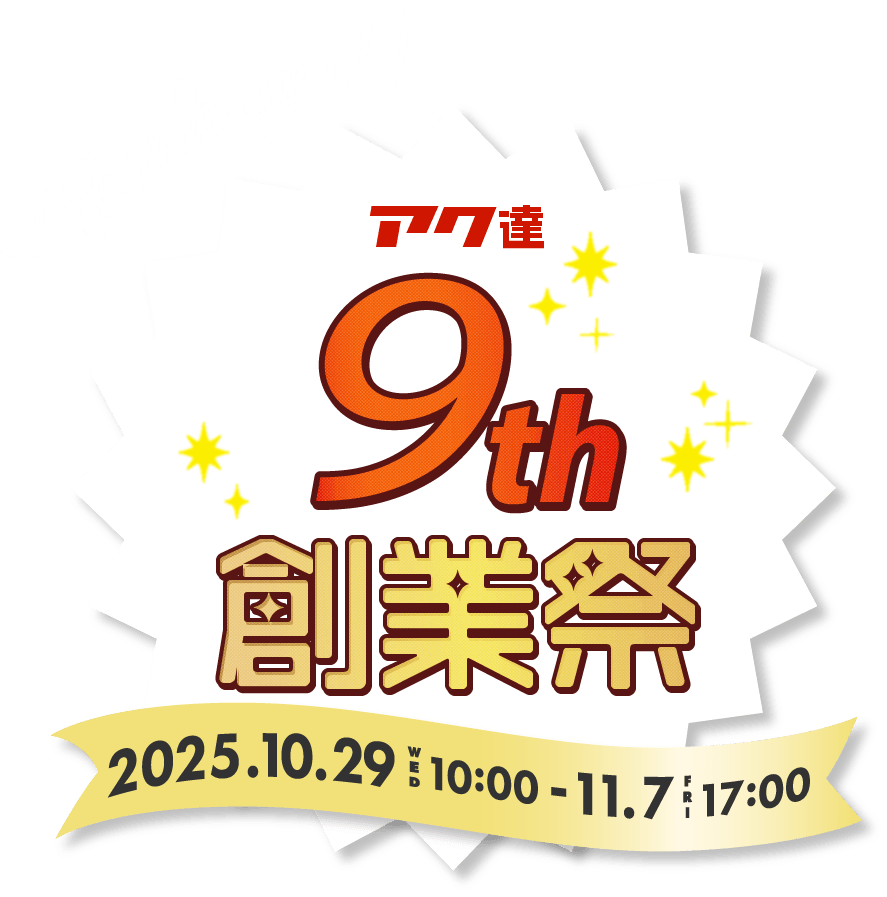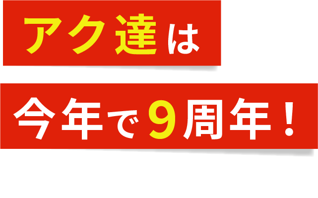 アク達は今年で9周年! いつもご利用いただき誠にありがとうございます! 皆さまに支えられて9周年を迎えることができました。 ここまで長く続けられたのも皆さまのおかげです。 感謝の気持ちを込めて、豪華5大企画をご用意✨ 1年に1回のお祭りを一緒に楽しんでいただけたら嬉しいです♪