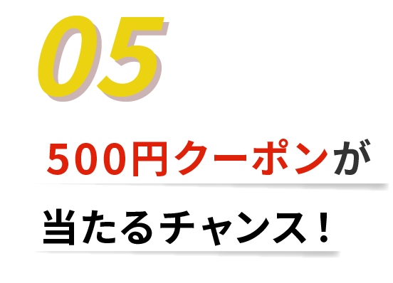 期間中にご注文いただいた会員様を対象に抽選を行い 合計10名様に500円クーポンをプレゼント! 当選された方にはキャンペーン終了後1か月ごろを目安に メールにてクーポンコードをお送りいたします。