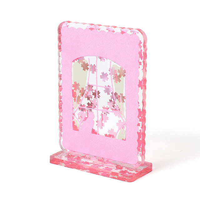 ピンク色のキラキラなさくらフレークがぎゅっと詰まった特別なアクリルです。側面はフレークを反射してほんのりピンクに色づきます。